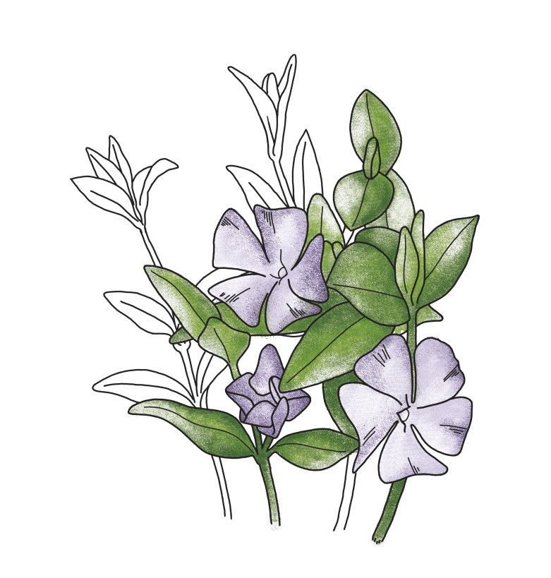 - Florile sale albastre spre violet, au câte cinci petale înclinate oblic. Printre soiurile sale horticole se pot găsi și varietăți cu flori de altă culoare (alb, roșu-închis, violet). Fructul său este o foliculă dublă.