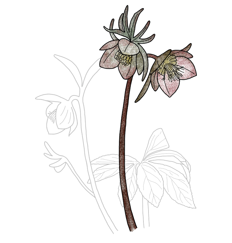 - Axa florală se dezvoltă primăvara, cu o floare terminală de diametrul 6-8 cm. Învelișul floral este alcătuit din 5 sepale cu suprafața externă de culoare mov-verzui, respectiv violet. Petalele s-au transformat în rezervoare de miere. Floarea are multe stamine, zona pistilului se compune din 3-6 carpele concrescute la bază.